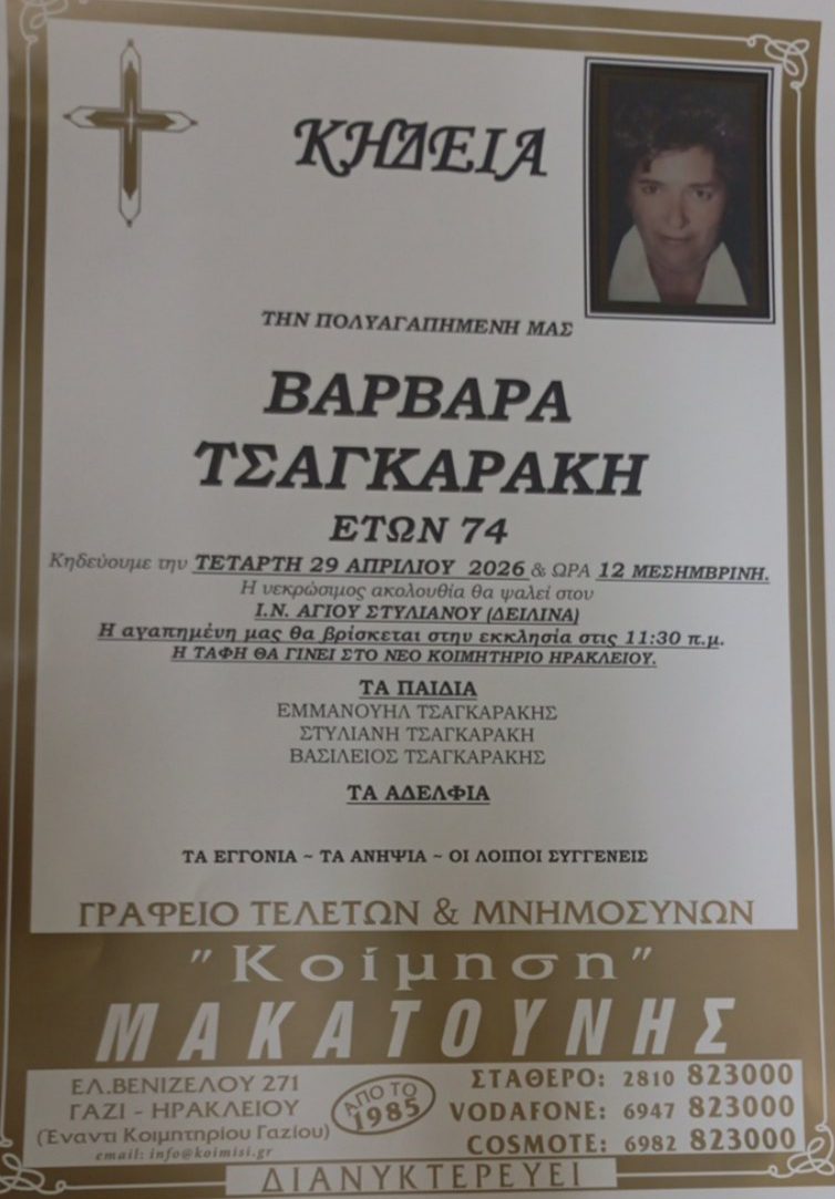 Σήμερα Τετάρτη 29 Απριλίου στις 12 το μεσημέρι στο Ι.Ν. Αγίου Στυλιανού στα Δειλινά Ηρακλείου θα τελεστεί η κηδεία της Βαρβάρας Τσαγκαράκη.