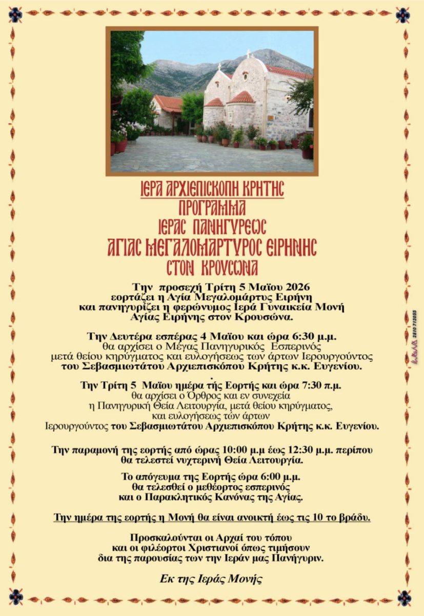 Με τη δέουσα θρησκευτική κατάνυξη και τη συμμετοχή πλήθους πιστών που συρρέουν από ολόκληρη την Κρήτη, ετοιμάζεται να εορτάσει στην Ιερά Γυναικεία Μονή της Αγίας Ειρήνης στον Κρουσώνα, παραμονή και ανήμερα του εορτασμού την προσεχή Τρίτη 5 Μαΐου 2026.