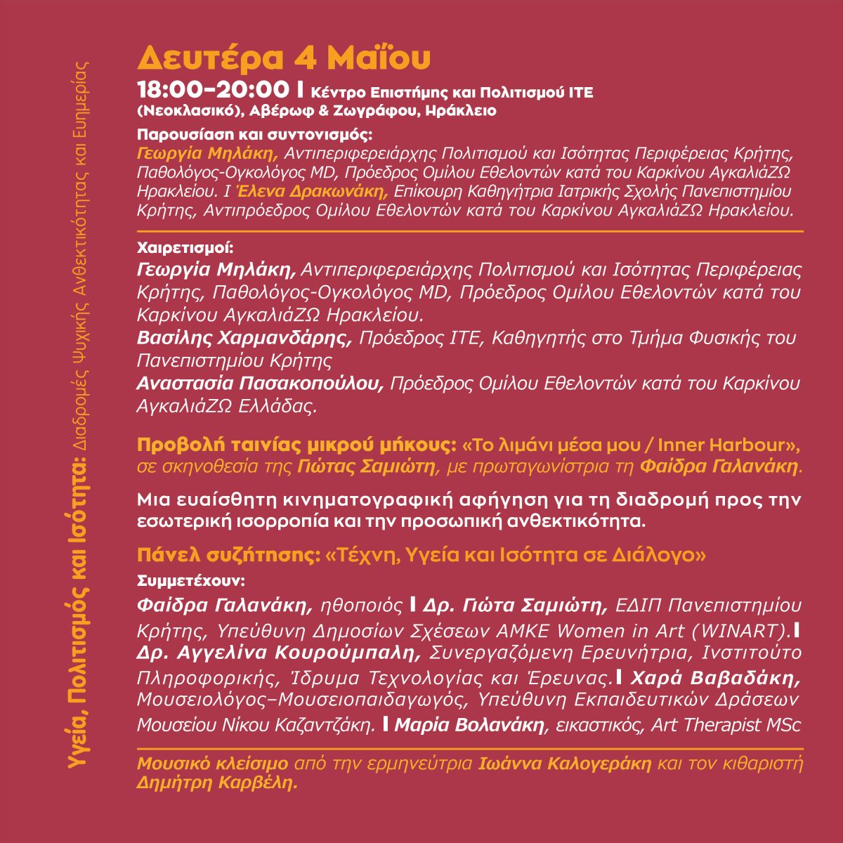 Ζωγράφου, Ηράκλειο), εκδήλωση με τίτλο «Υγεία, Πολιτισμός και Ισότητα: